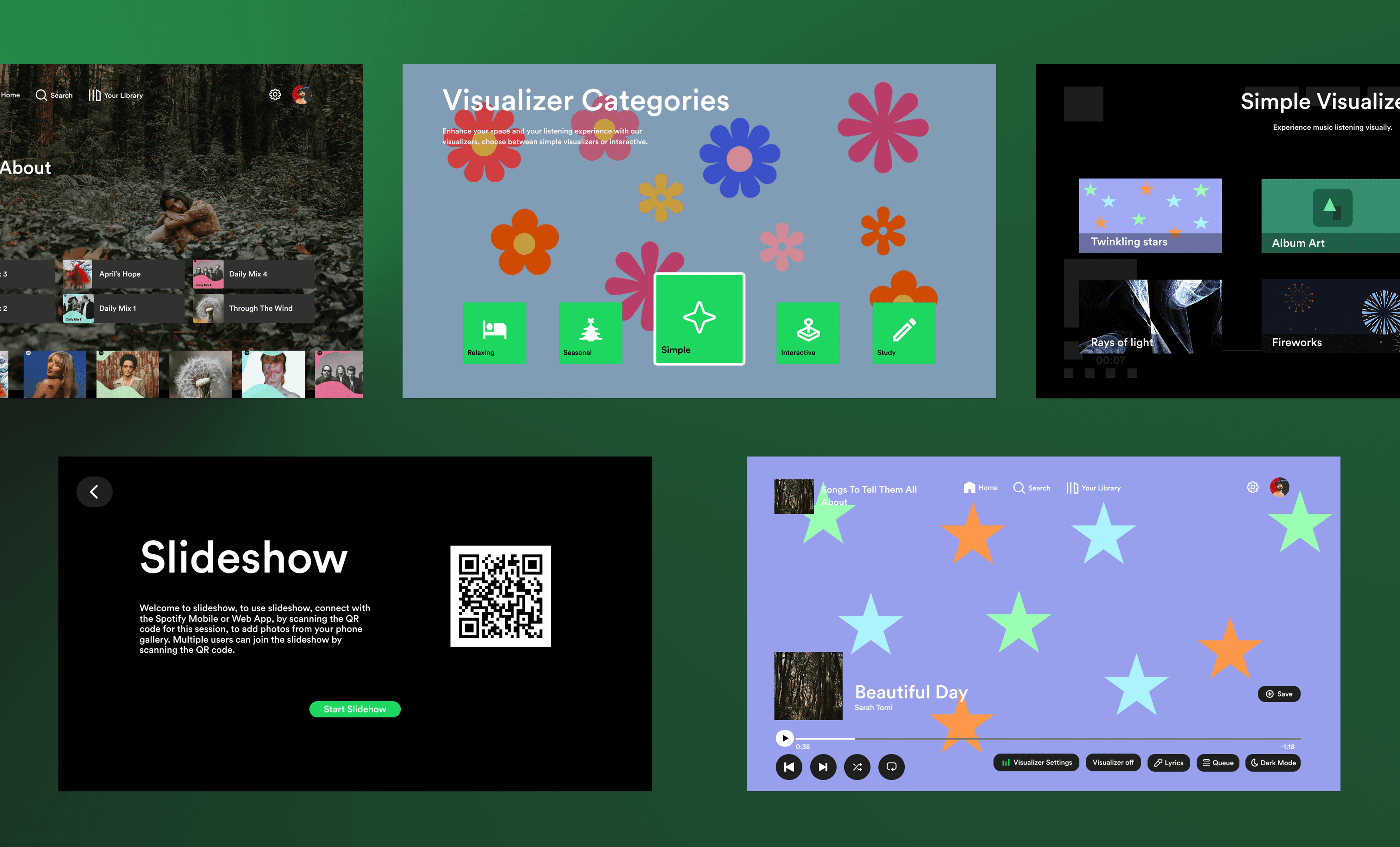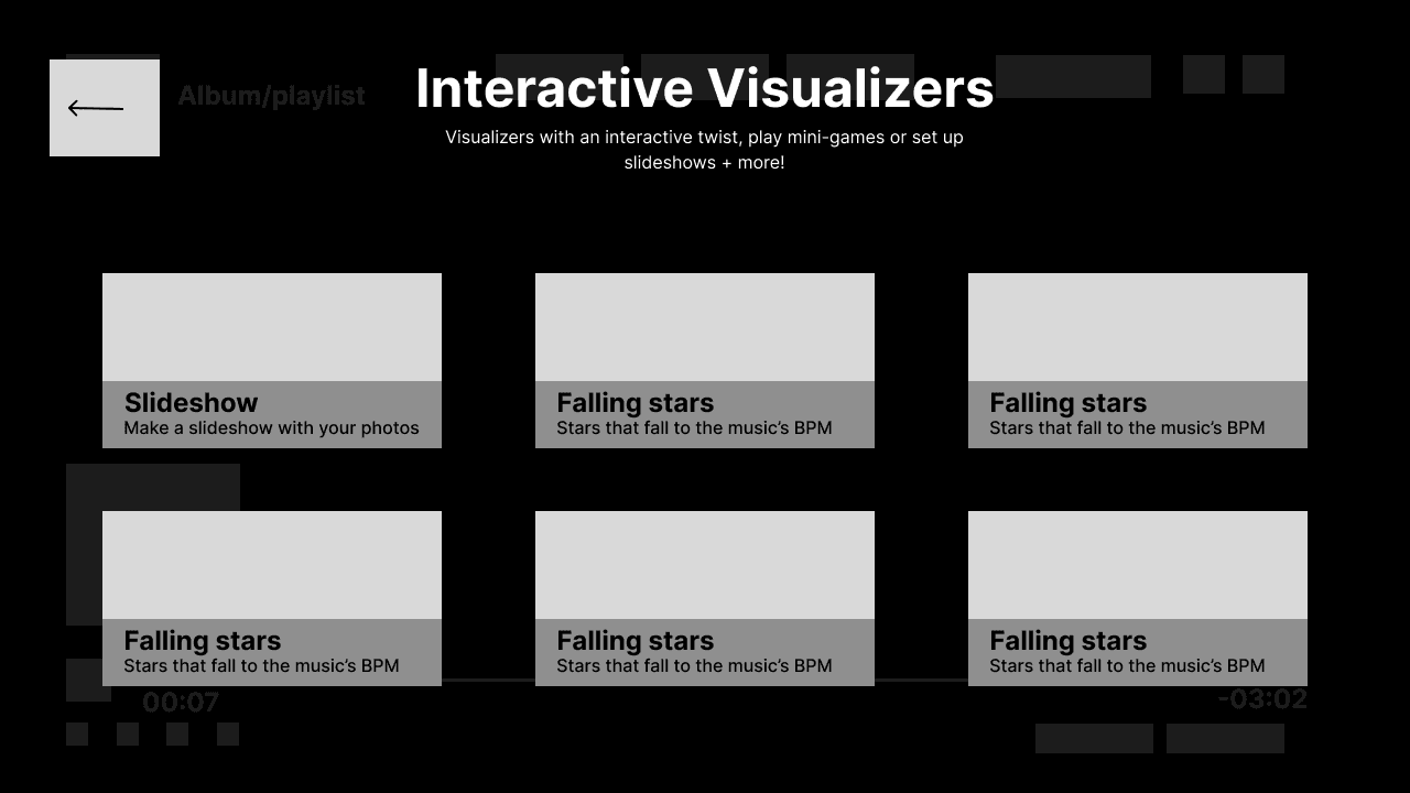 I implemented the visualizer functionality into the music player page to fit seamlessly with the current Spotify TV app experience, with a focus on adding to the current user flow rather than redesigning the entire experience. I designed with the TV experience in mind, making sure not only the visualizers themselves were visual, but the selection pages too, with previews on both the category selection pages and the visualizer selections themselves.