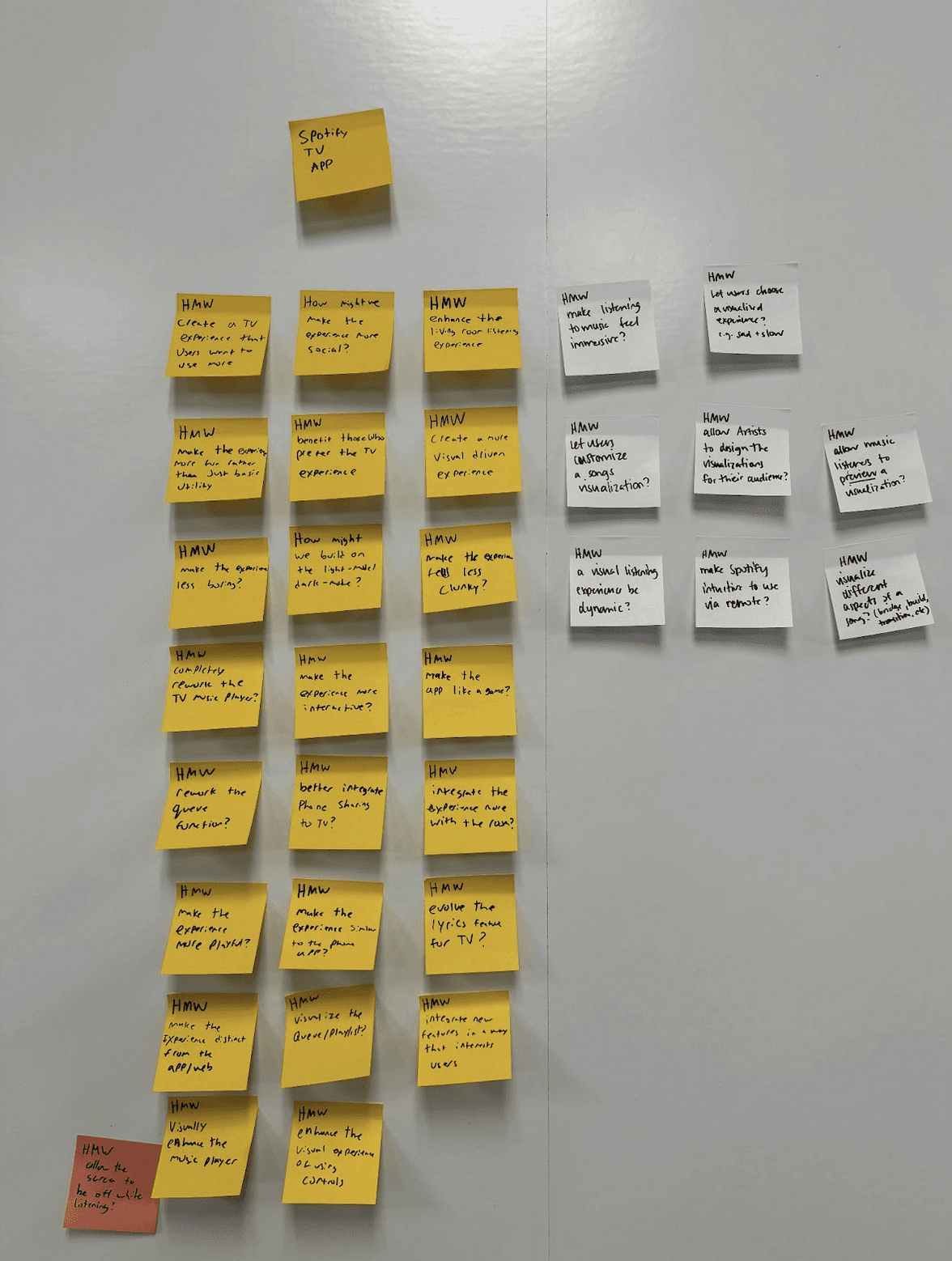 To further explore adding a visual and interactive functionality to the Spotify TV App, I indentify my user groups and their goals, and then moved onto ideation to help develop my visualizer ideas, through exercises such as Crazy 8s and how might we statements. I then did user testing with paper prototyping and a basic prototype done by Figma Make to test out the user flows.